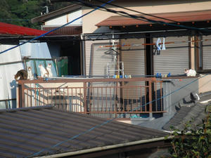 その後、両面テープを施した剣山のようなトゲトゲな材料を手すりに施した。ハトが止まらなくなるようだ。