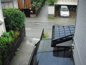 以前もあったのだが、あふれた水が自宅の敷地にたまり冠水状態となる。