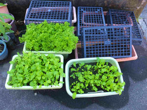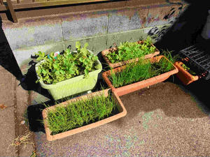 ケースをかぶせてあるプランターは収穫を終えたもので、また、青菜類の種を蒔く予定であるが鶏糞を入れてしばしお休みである。 -