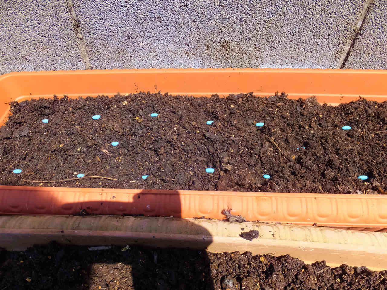 なぜそうするかというと、プランターの直播の場合は、表面近くに蒔くため、成長して実が付くにつれて重みで倒れてしまう。