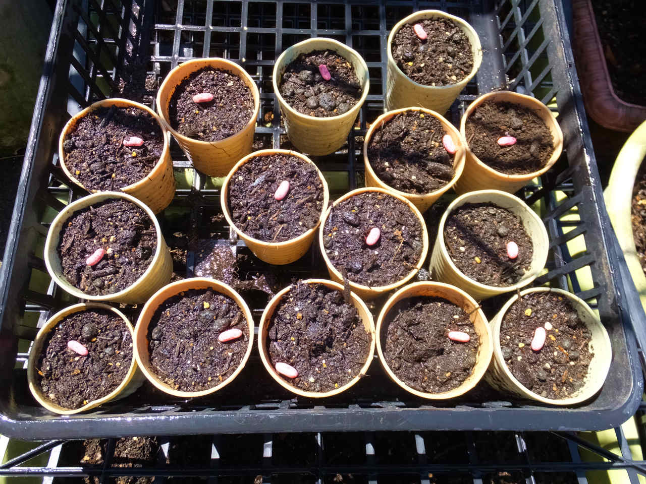 インゲンは、1つのプランターに定植用に小さな鉢に1粒づつ蒔いたのと、残りのプランターには直接蒔いた。