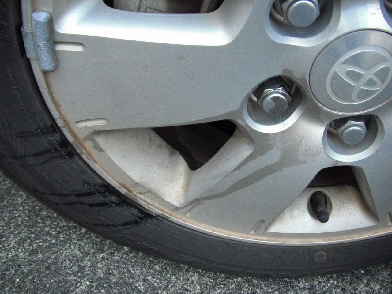 自分の車であるが、その前輪のホイール部分に液体がかかっている。