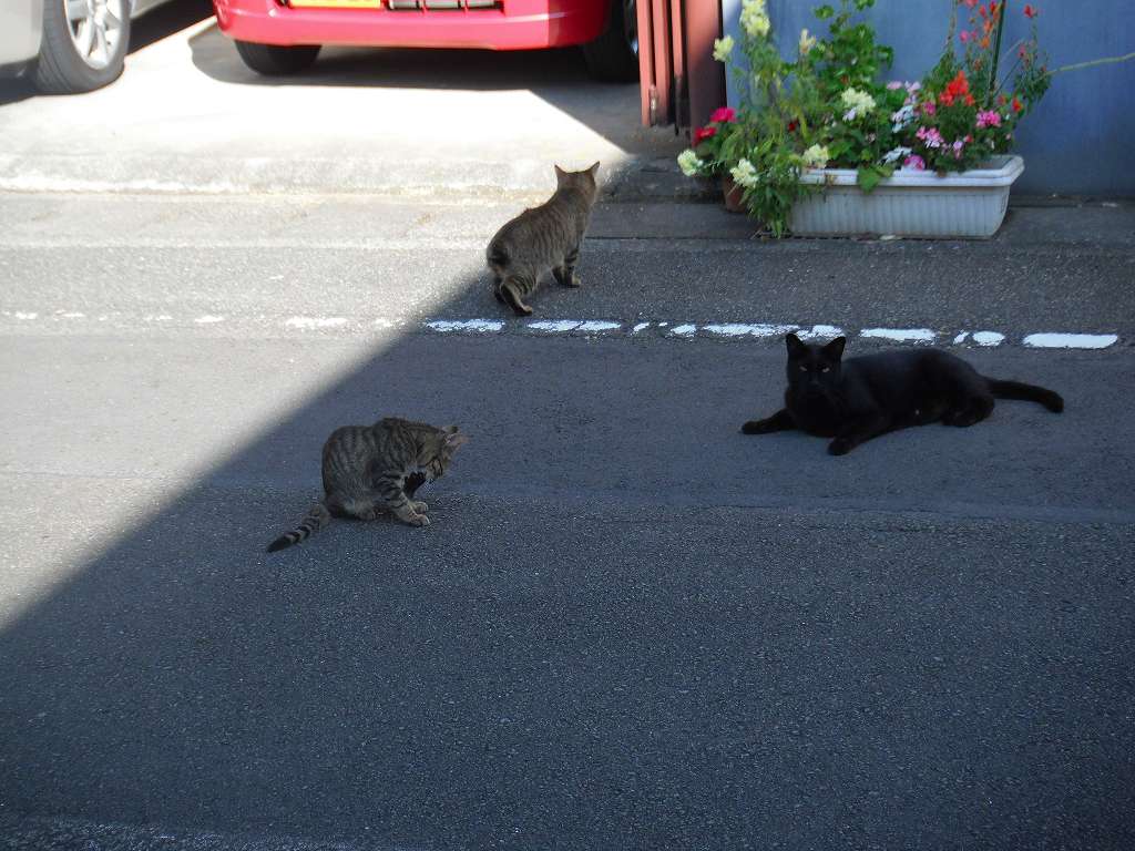 今朝も、家の外には、3匹の猫が道路に寝そべっている。