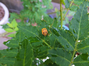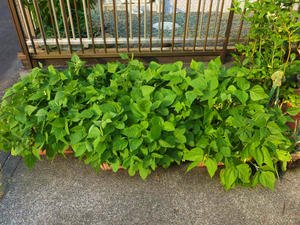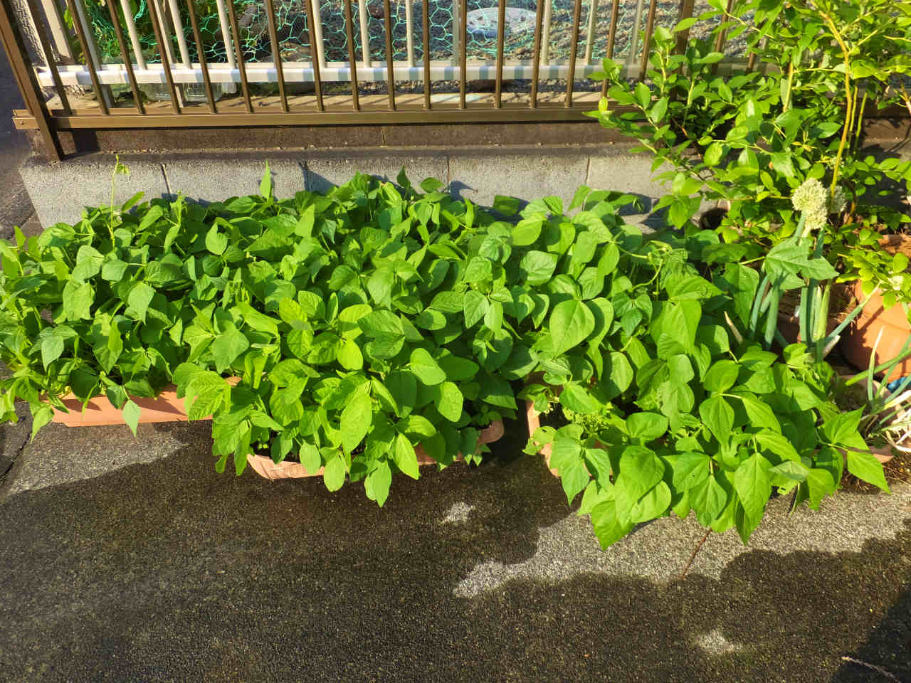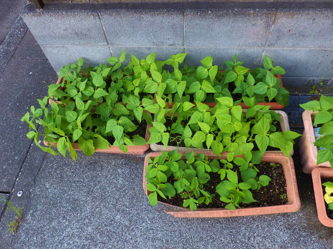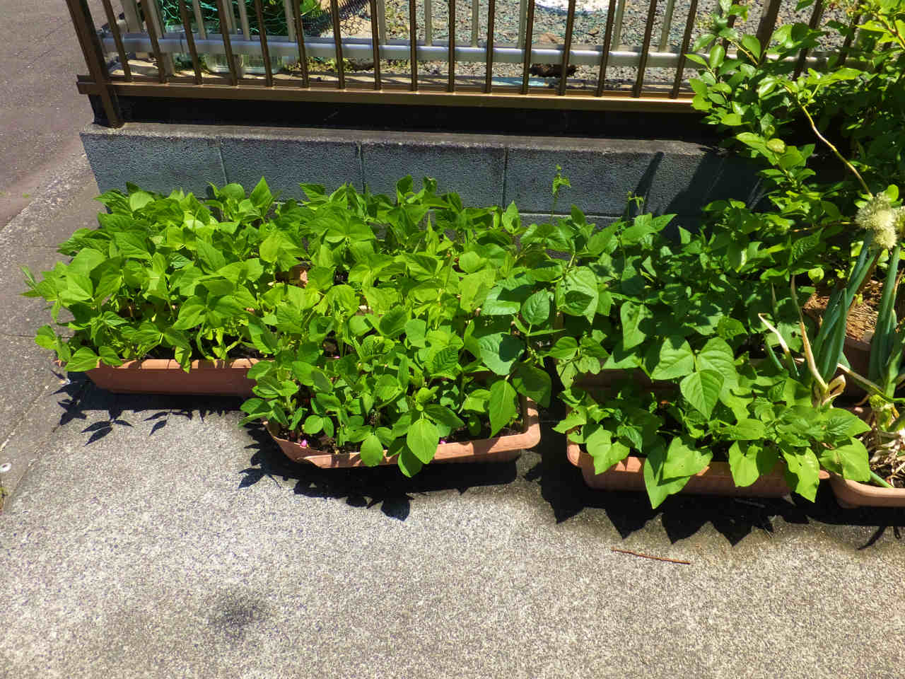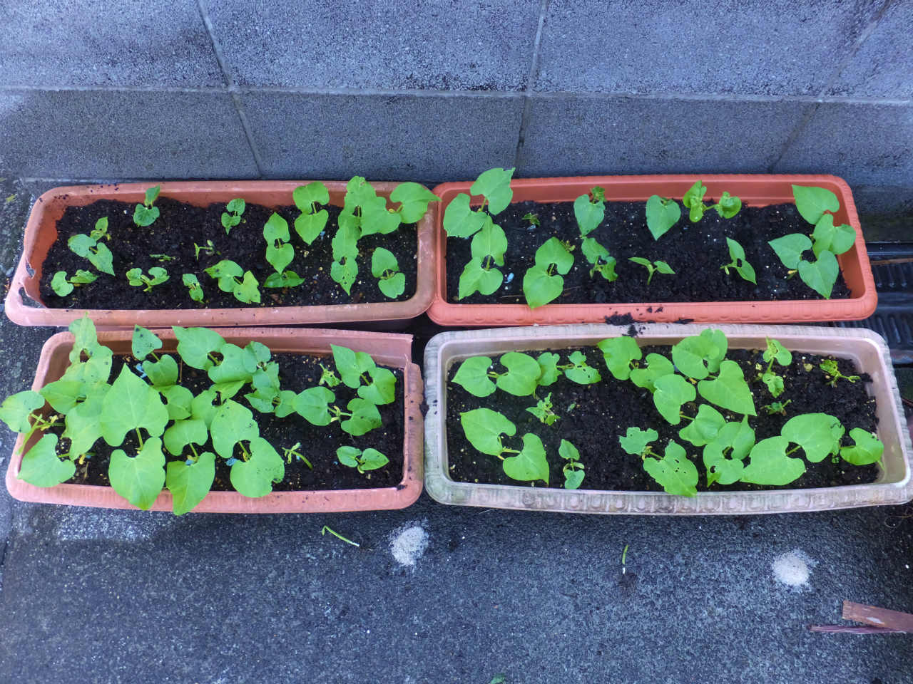 鉢に蒔いてあったインゲンは、成長したので、プランターの発芽しなかった部分に移植した。