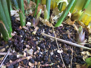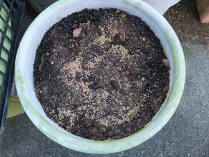 早速、苦土石灰を上からパラパラ蒔いて、土に混こんだ。