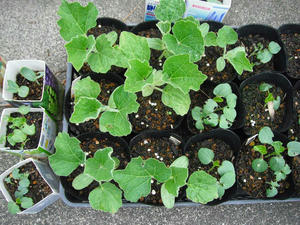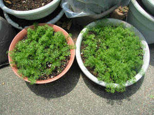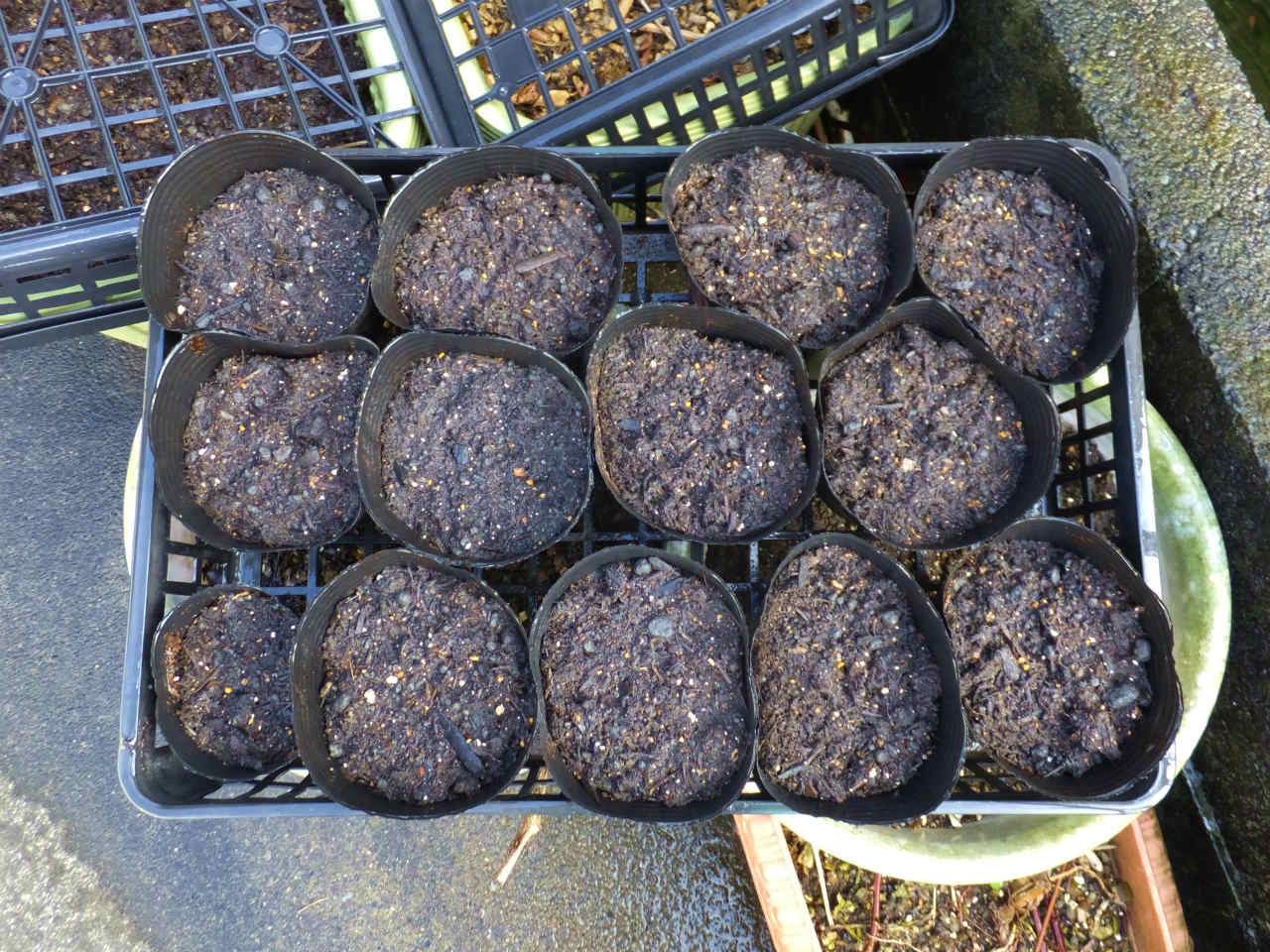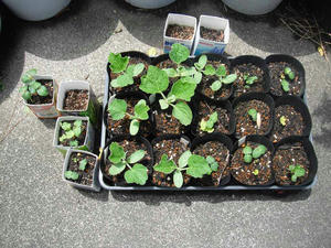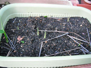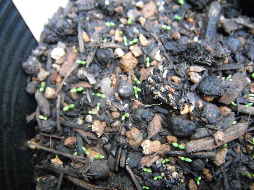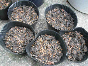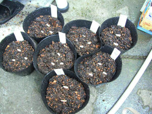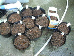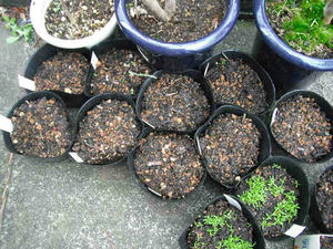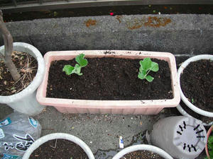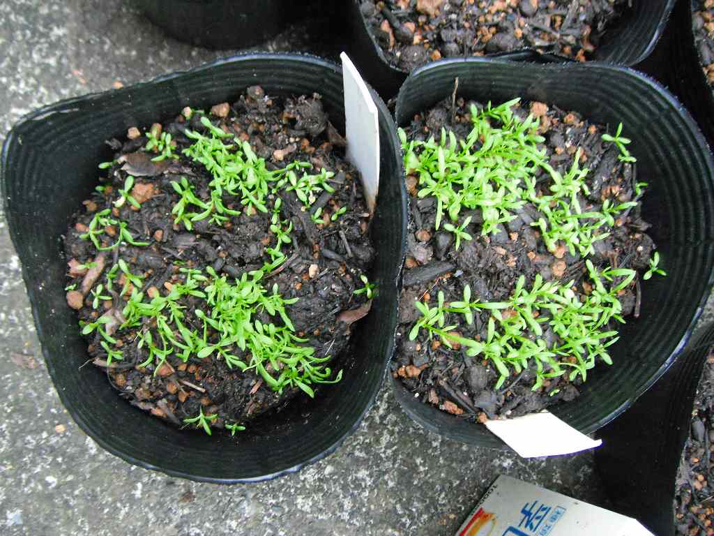 いつもは鉢に直播してしまうのであるが、今年は鉢にまいて、成長した時点で移植する方法でやることにした。