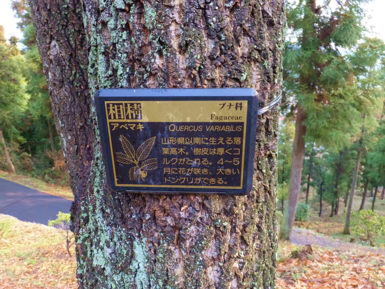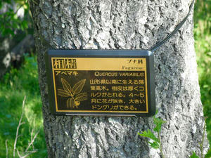 本日、ドングリを拾った木の近くに行ったら、木に「アベマキ」とネームプレートがしてあった。