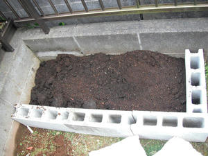 ブロックを並べた後は、生ごみ処理機で作成した堆肥と培養土を混ぜ合わせて土にする。