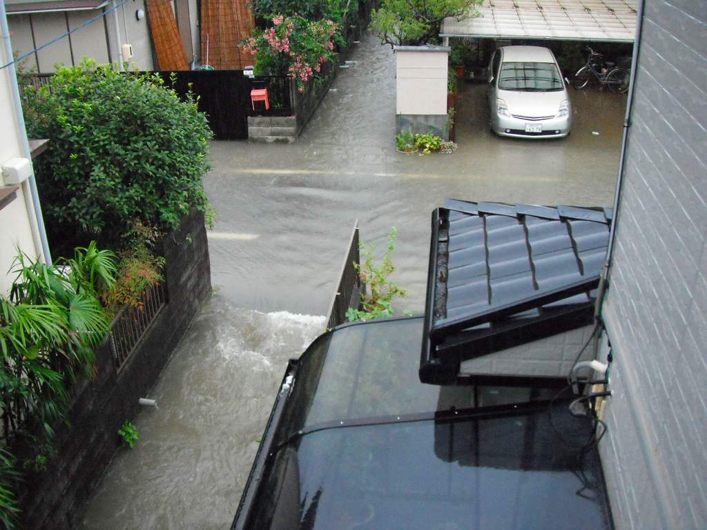 以前もあったのだが、あふれた水が自宅の敷地にたまり冠水状態となる。