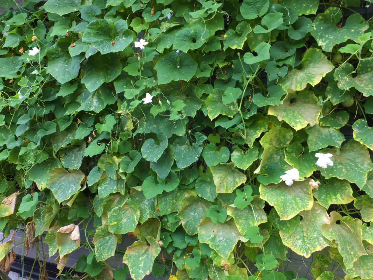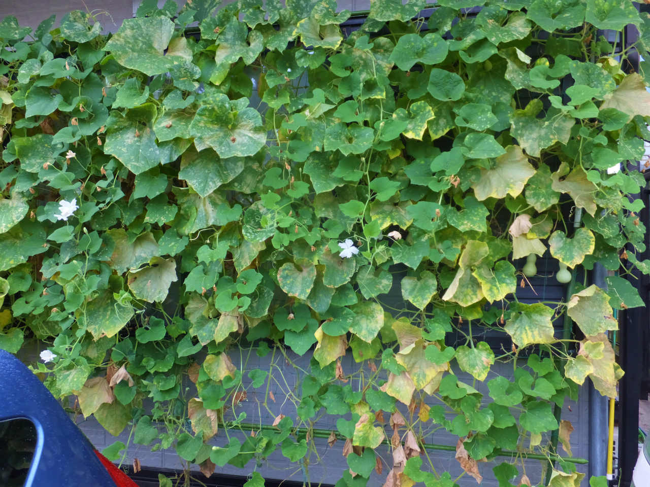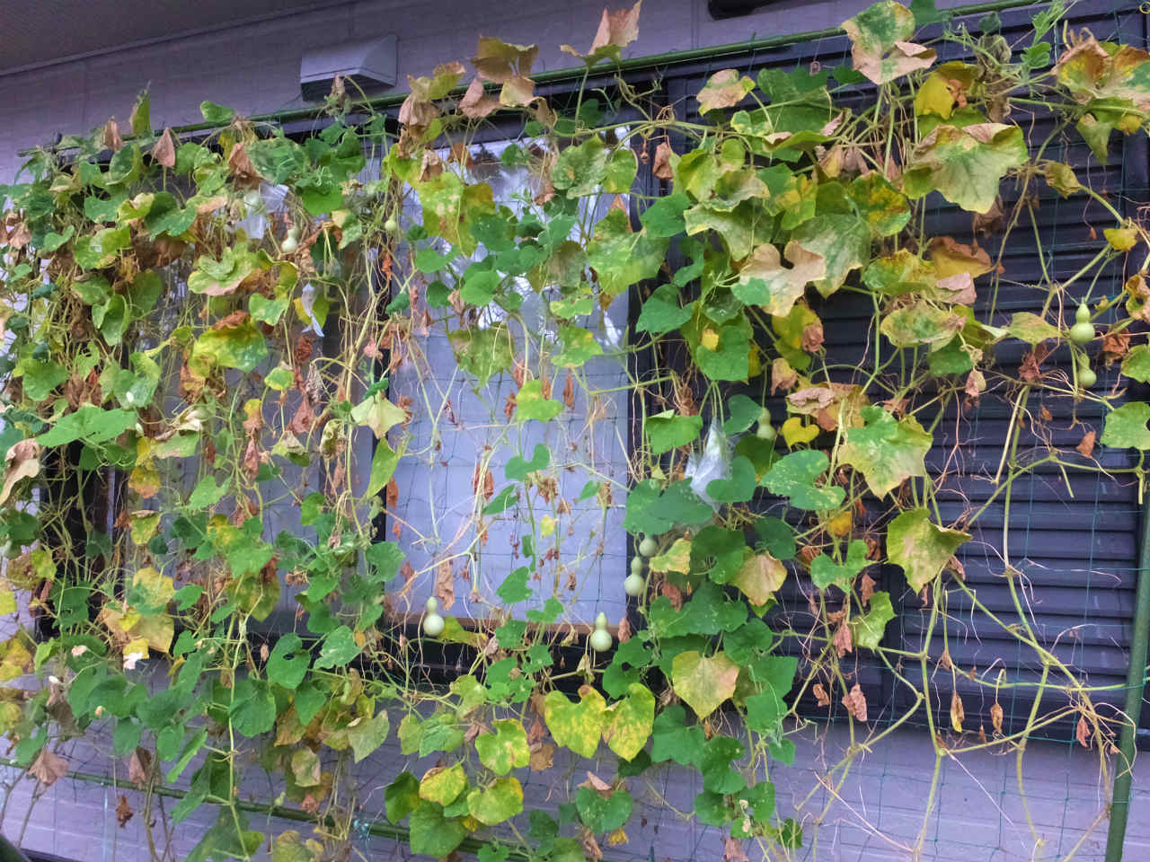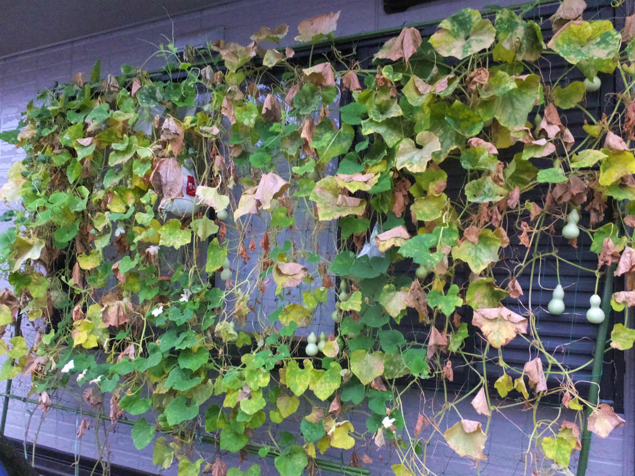 西側のヒョウタンの葉は、黄色くなったりした葉を処分するとグリーンカーテンの役割が危うくなってきた。