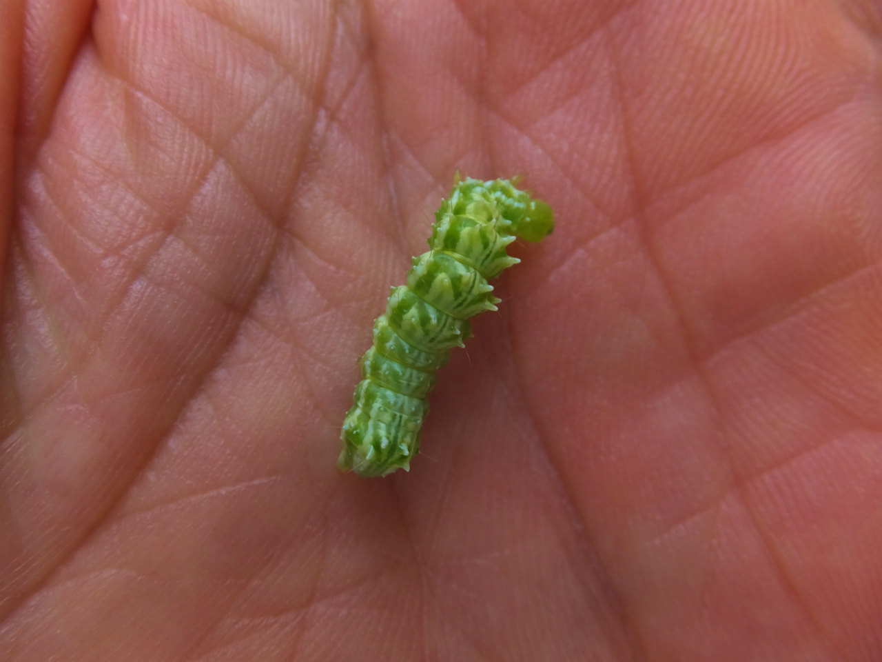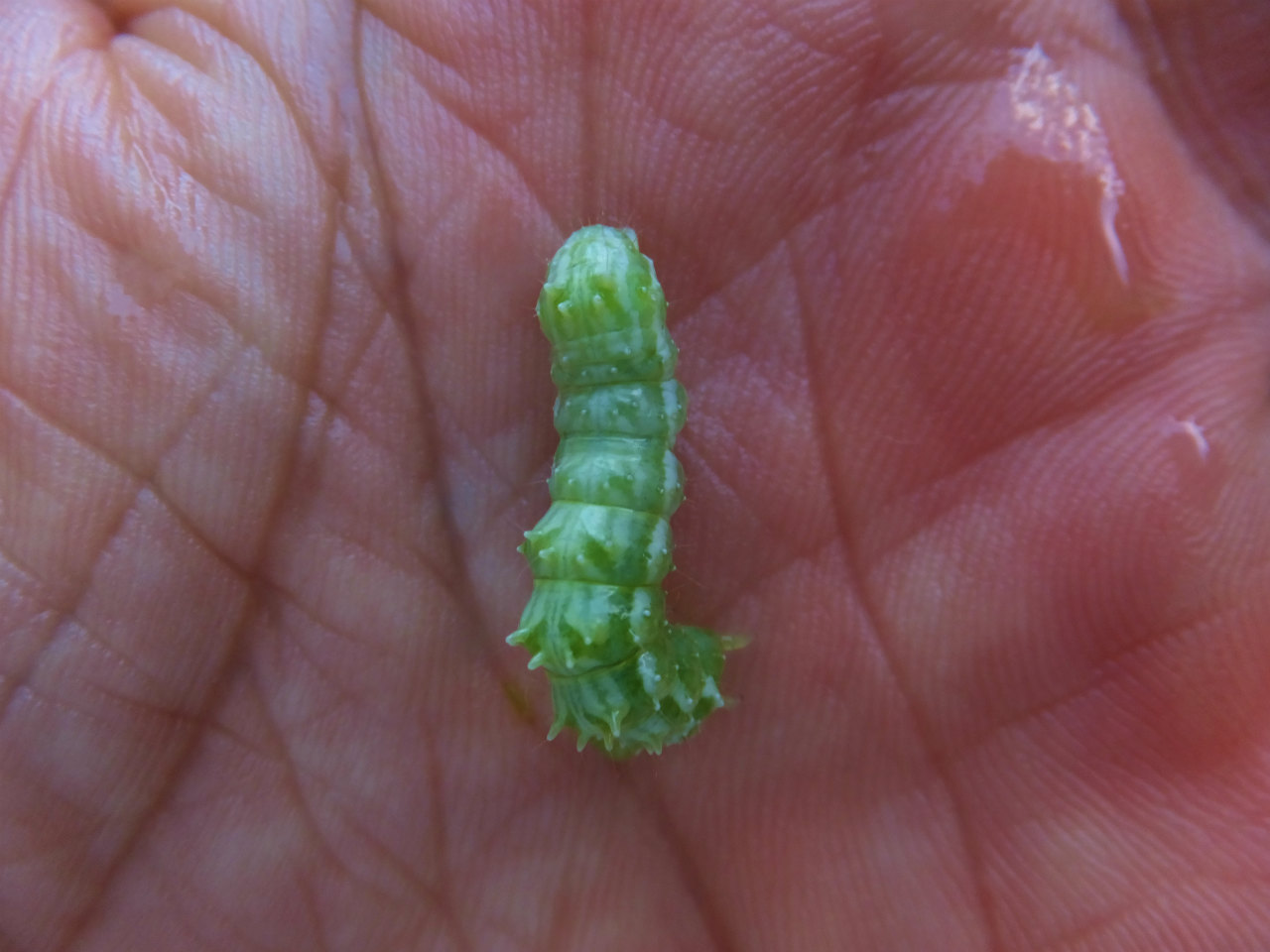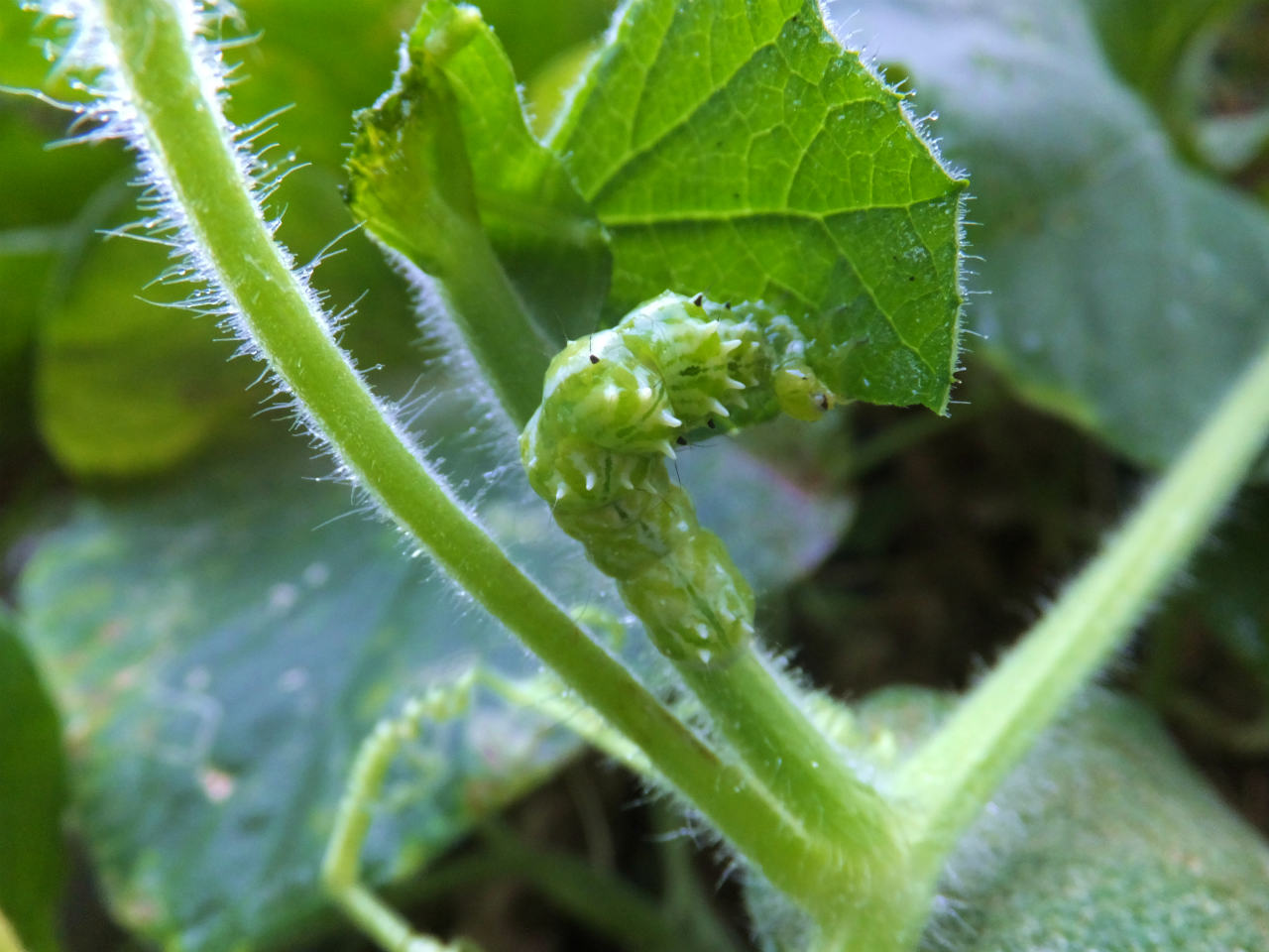 農薬散布中に葉の状態を確認したが、ウリキンウワバの幼虫を発見