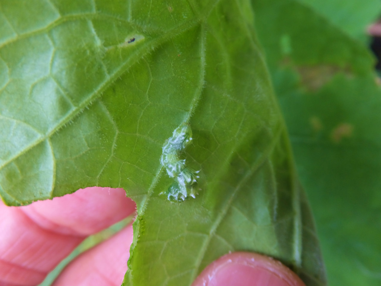確認すると、葉にウリキンウワバの幼虫がたくさん発生していた。