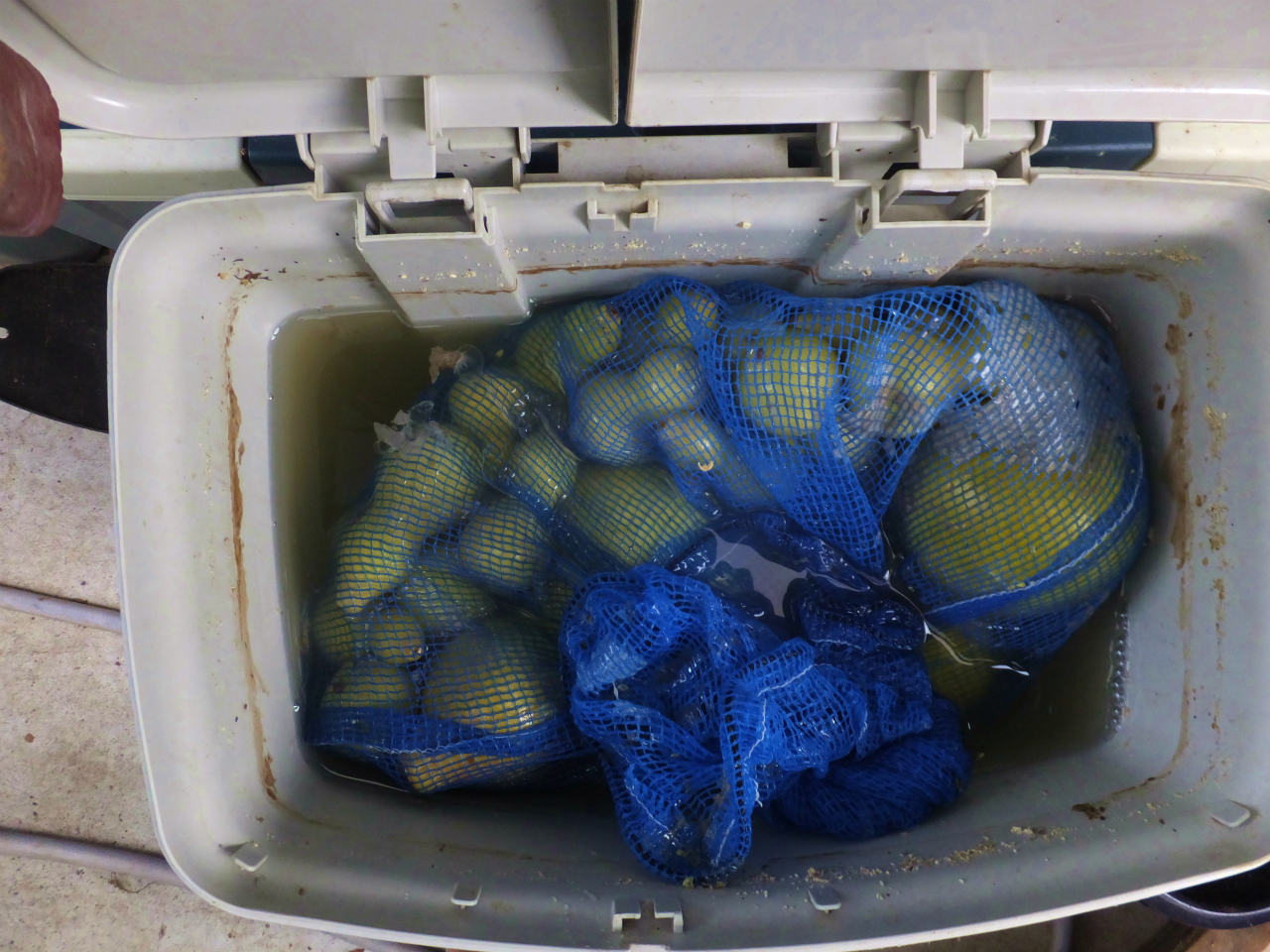 収穫して種だし中のヒョウタンは、本日は水の入れ替えと、ヒョウタン内部への水の注入作業を行った。
