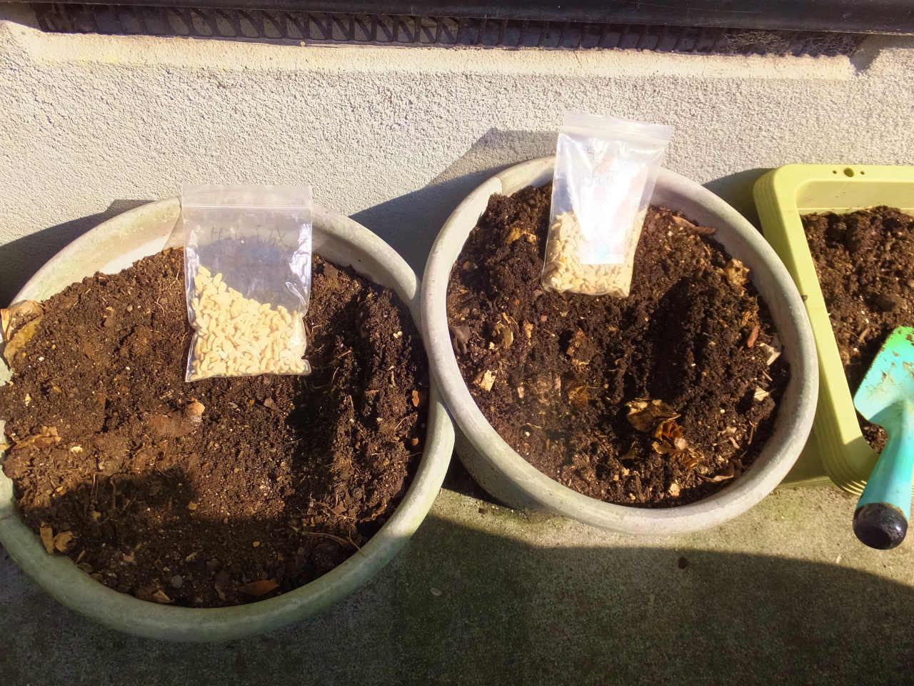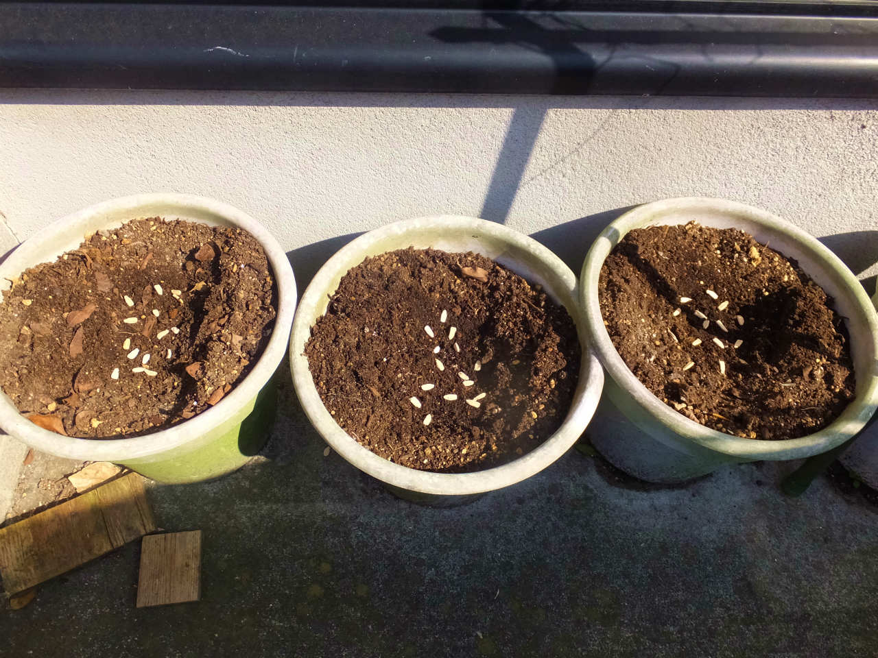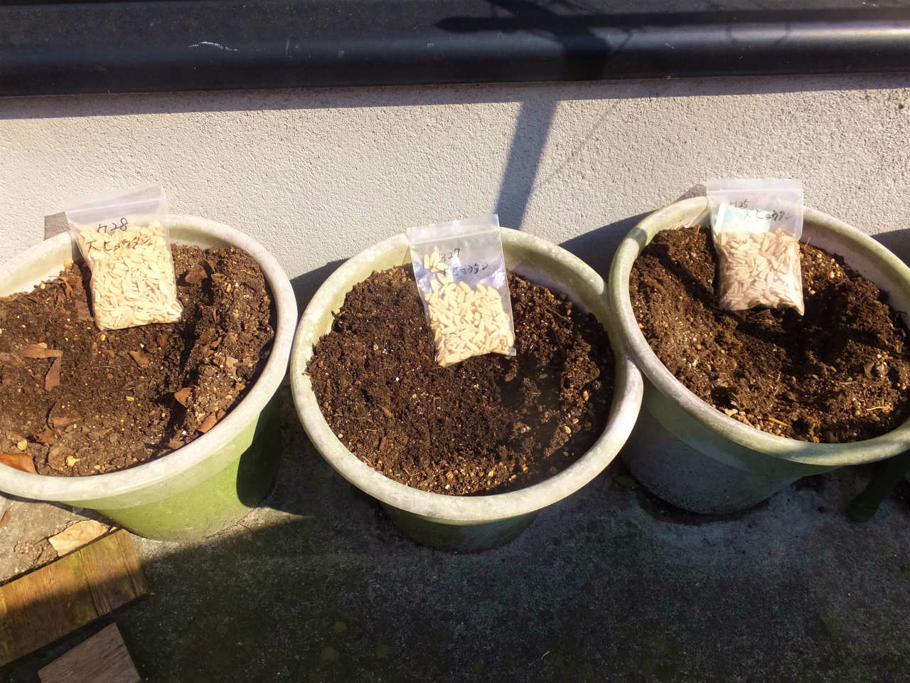 それぞれ、15粒づつを1つの鉢にまいて発芽するのか、発芽した場合は発芽率はどれくらいかを確認することにした。