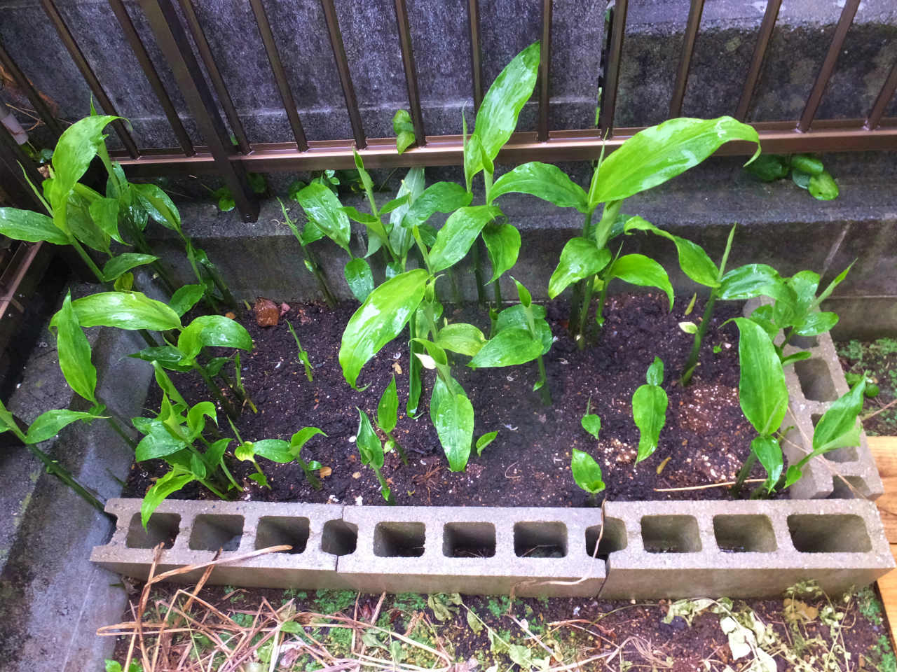 ミョウガの地下茎が、ブロックを置いただけの枠を押して広がってしまった。