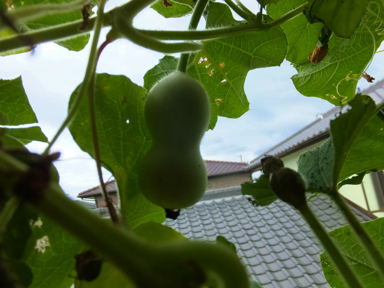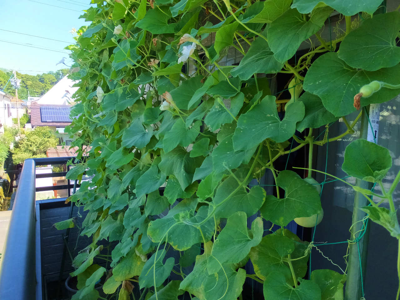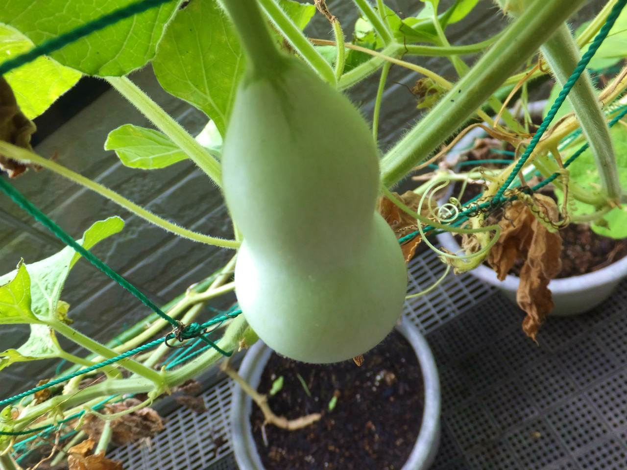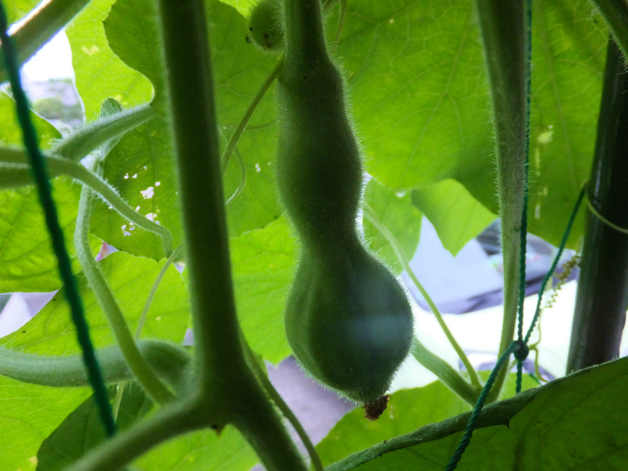 2階のヒョウタンは、1階より10日程後に設置したのでまだ葉がたくさんあり青々している。