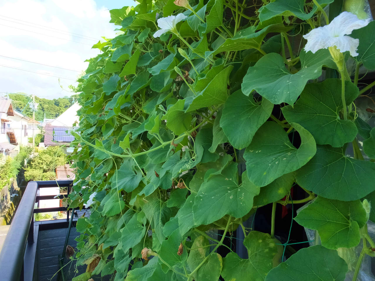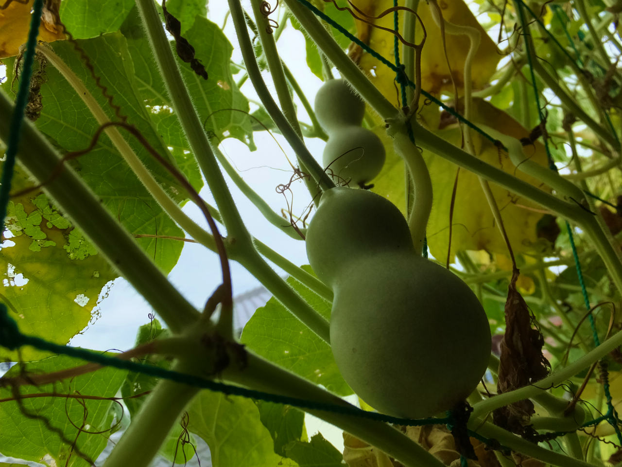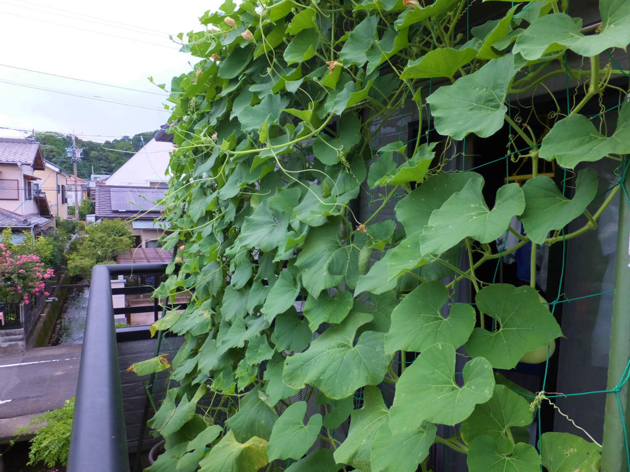 2階のヒョウタンは、1階より10日程後に設置したのでまだ葉がたくさんあり青々している。