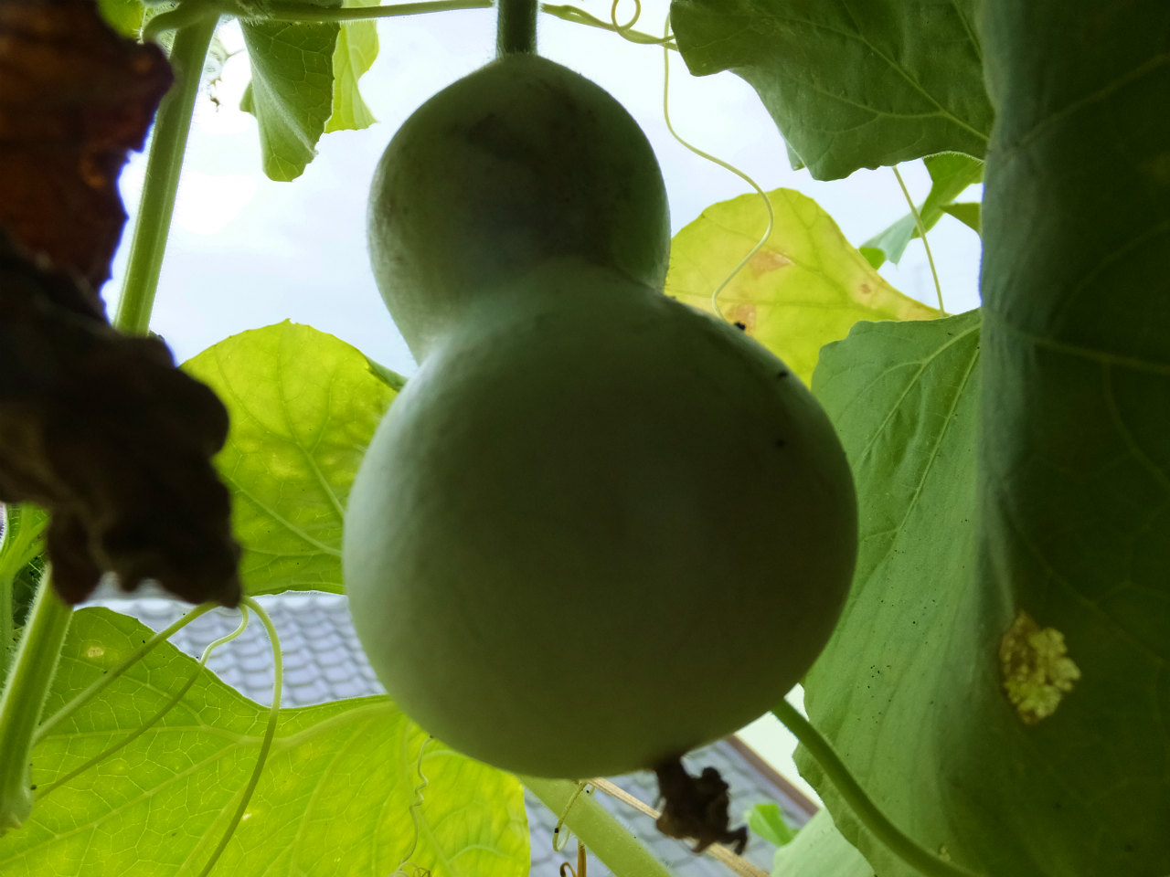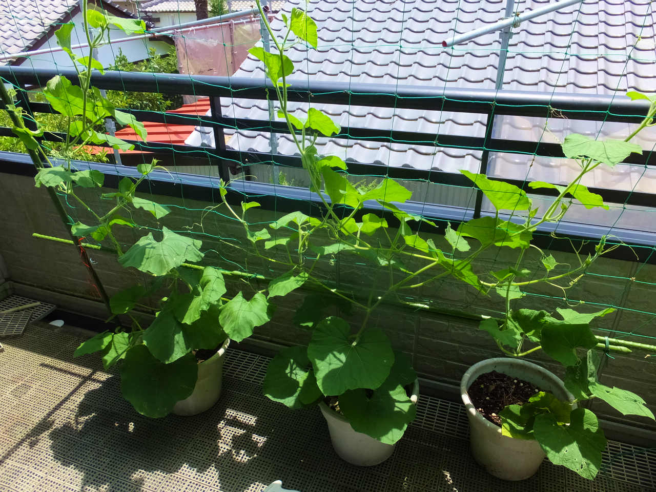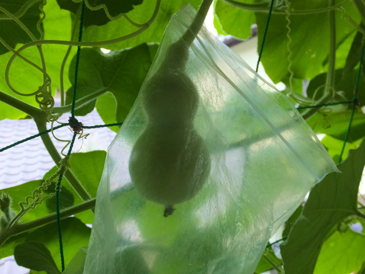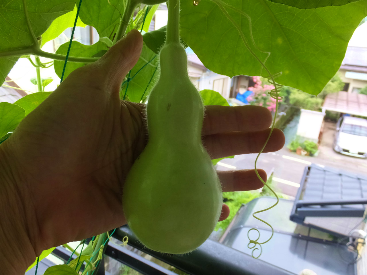 2階のヒョウタンは、1階より10日程後に設置したのでまだ葉がたくさんあり青々している。