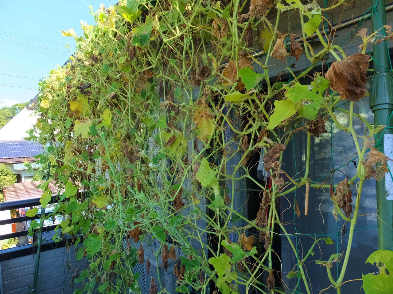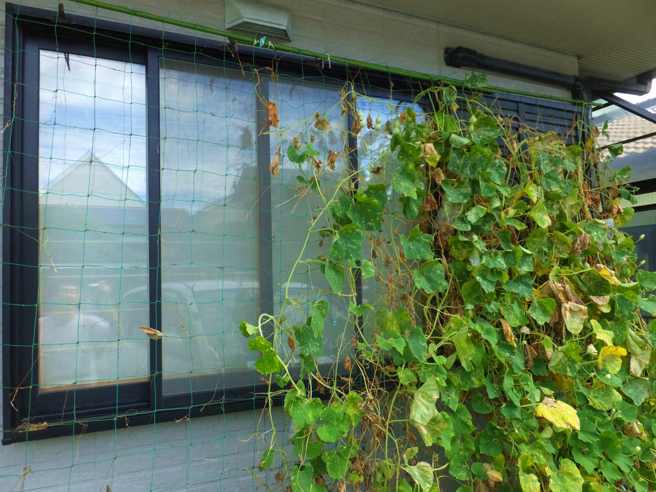 1階のヒョウタンは3本が枯れてしまったので、枯れた蔓を撤去したらグリーンカーテンは、こんな具合で、窓がある領域はまったく葉がなくなってしまった。