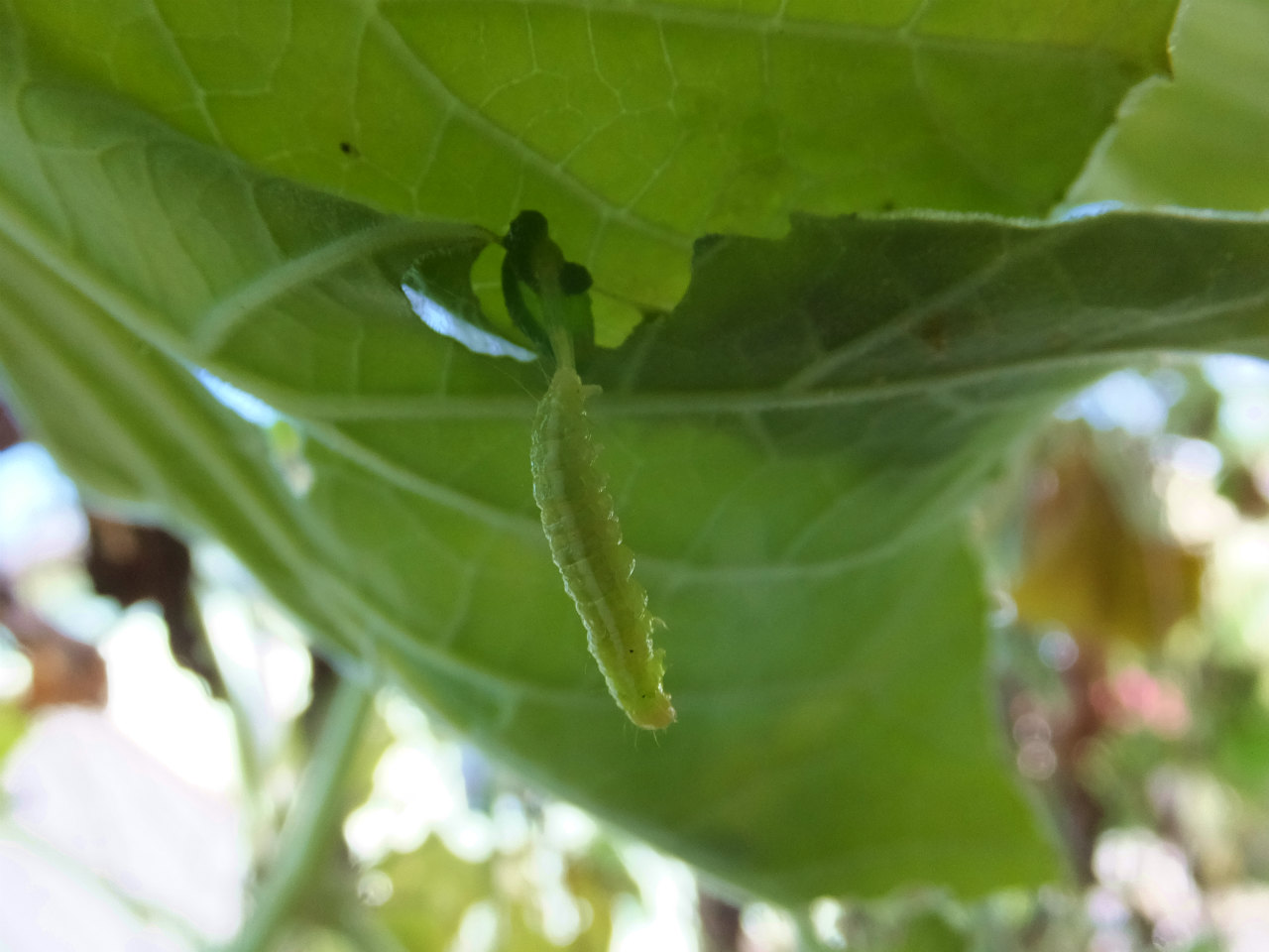 たぶんウリキンウワバの幼虫に仕業だと思われるが、周辺を探しても幼虫らしき芋虫が見当たらない。